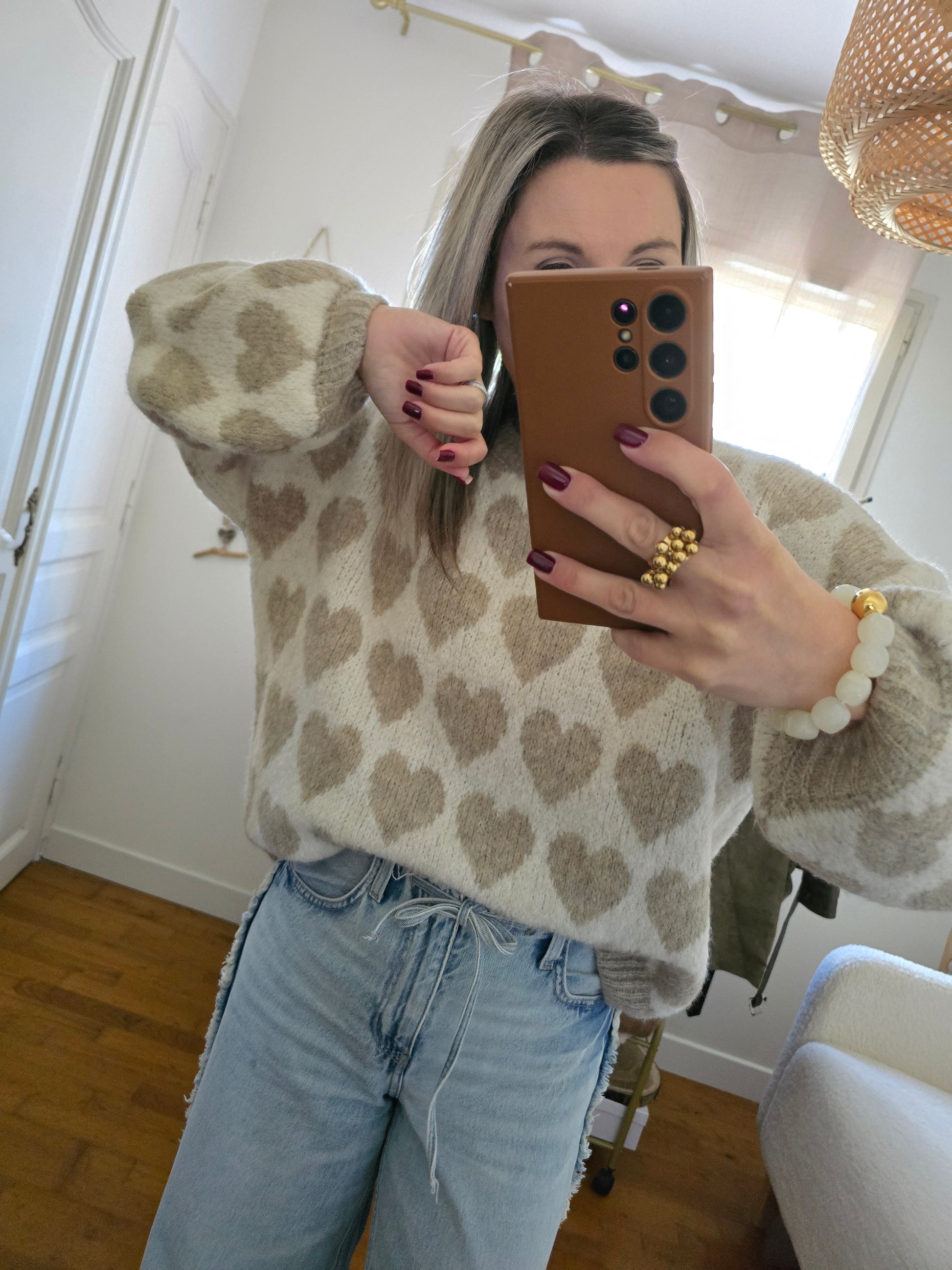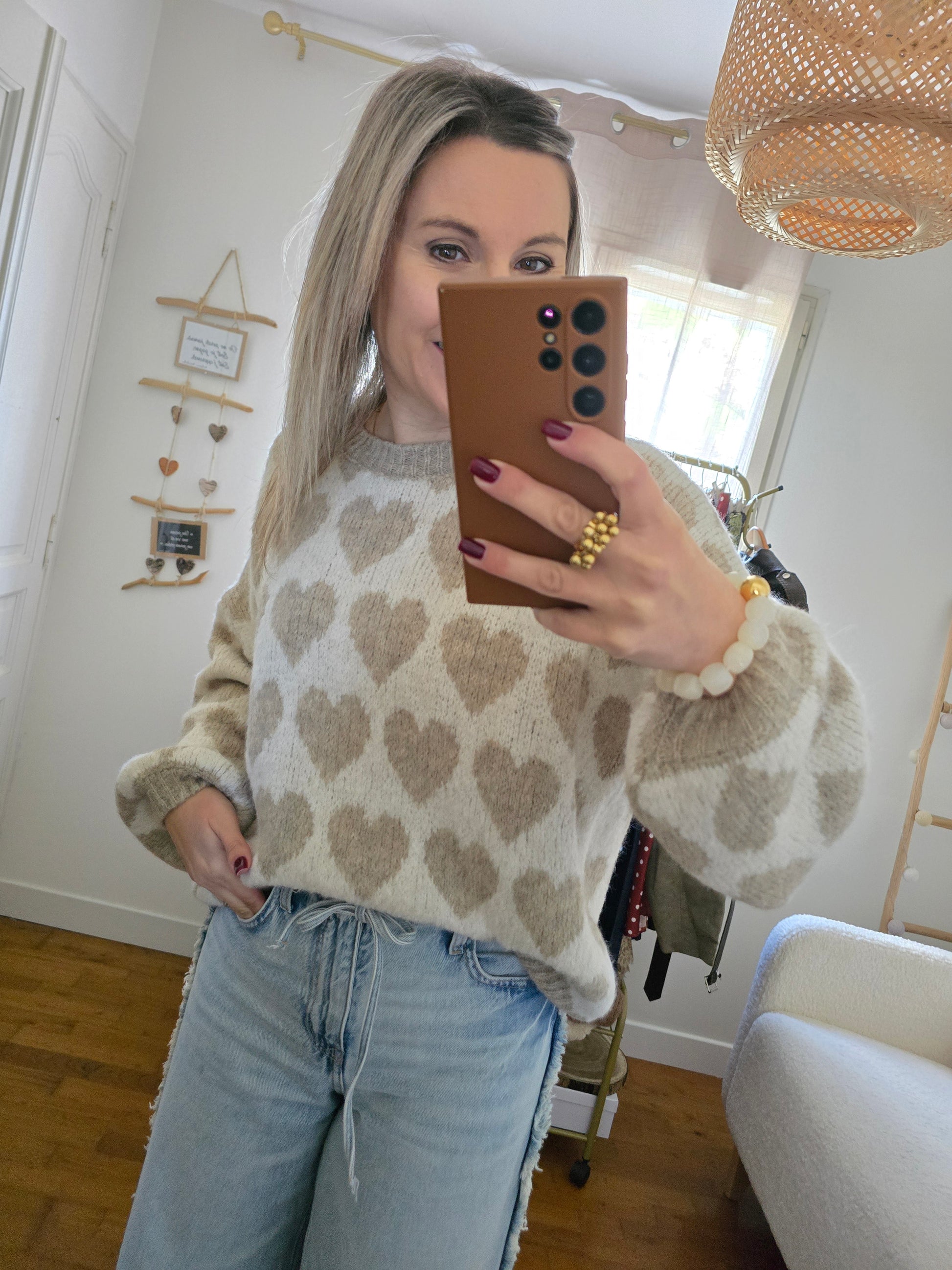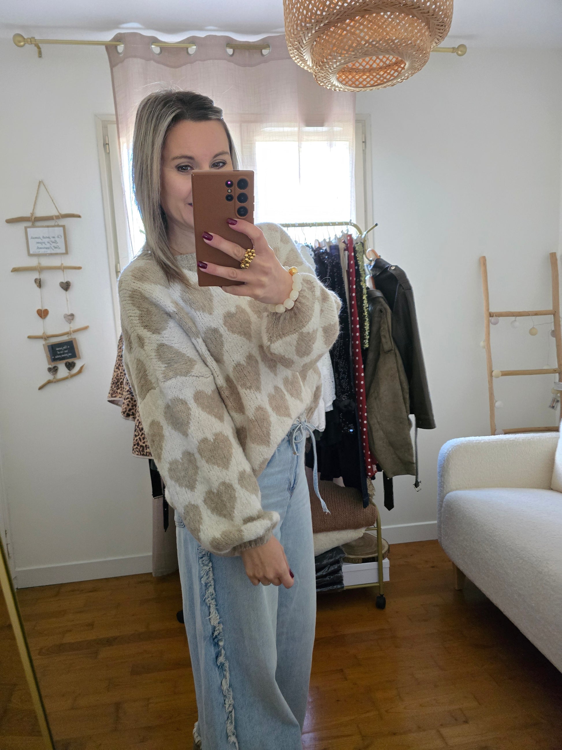 . Joli pull à motifs coeurs beiges sur fond écru, tout doux