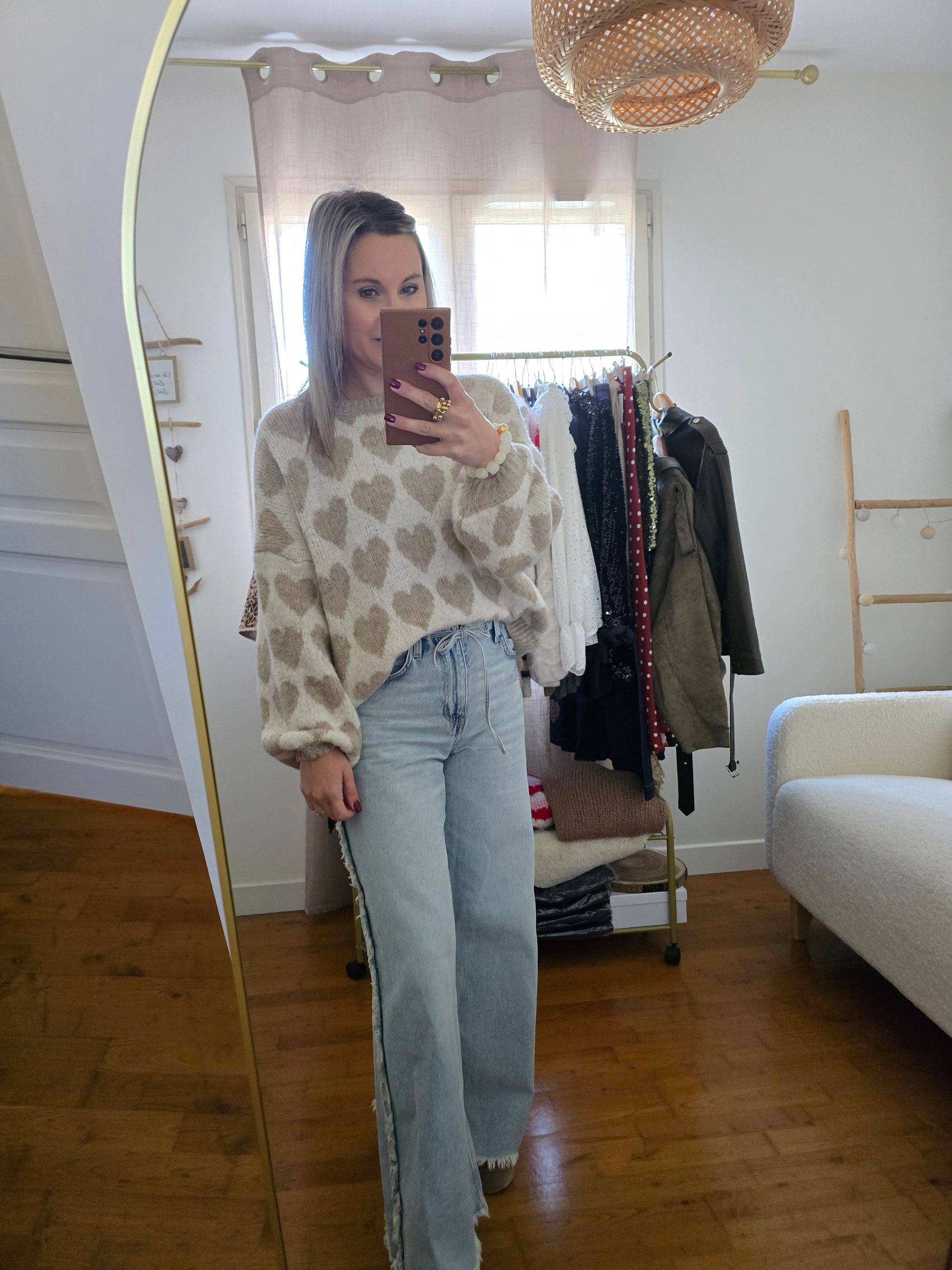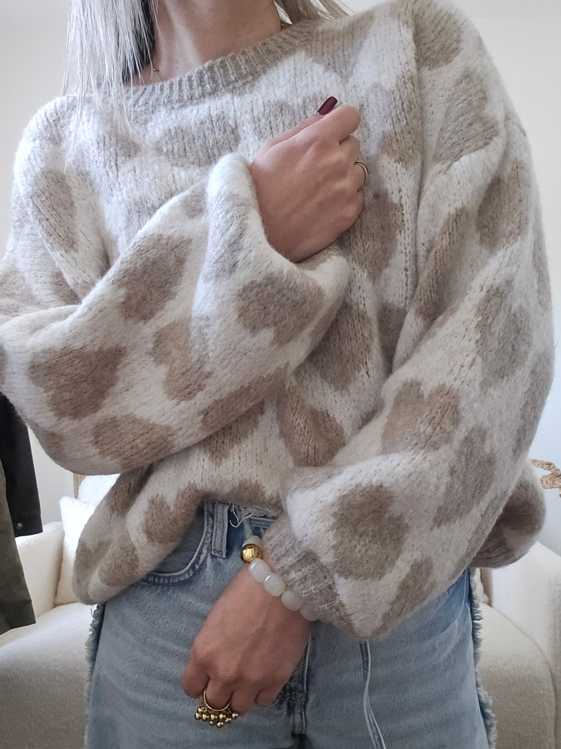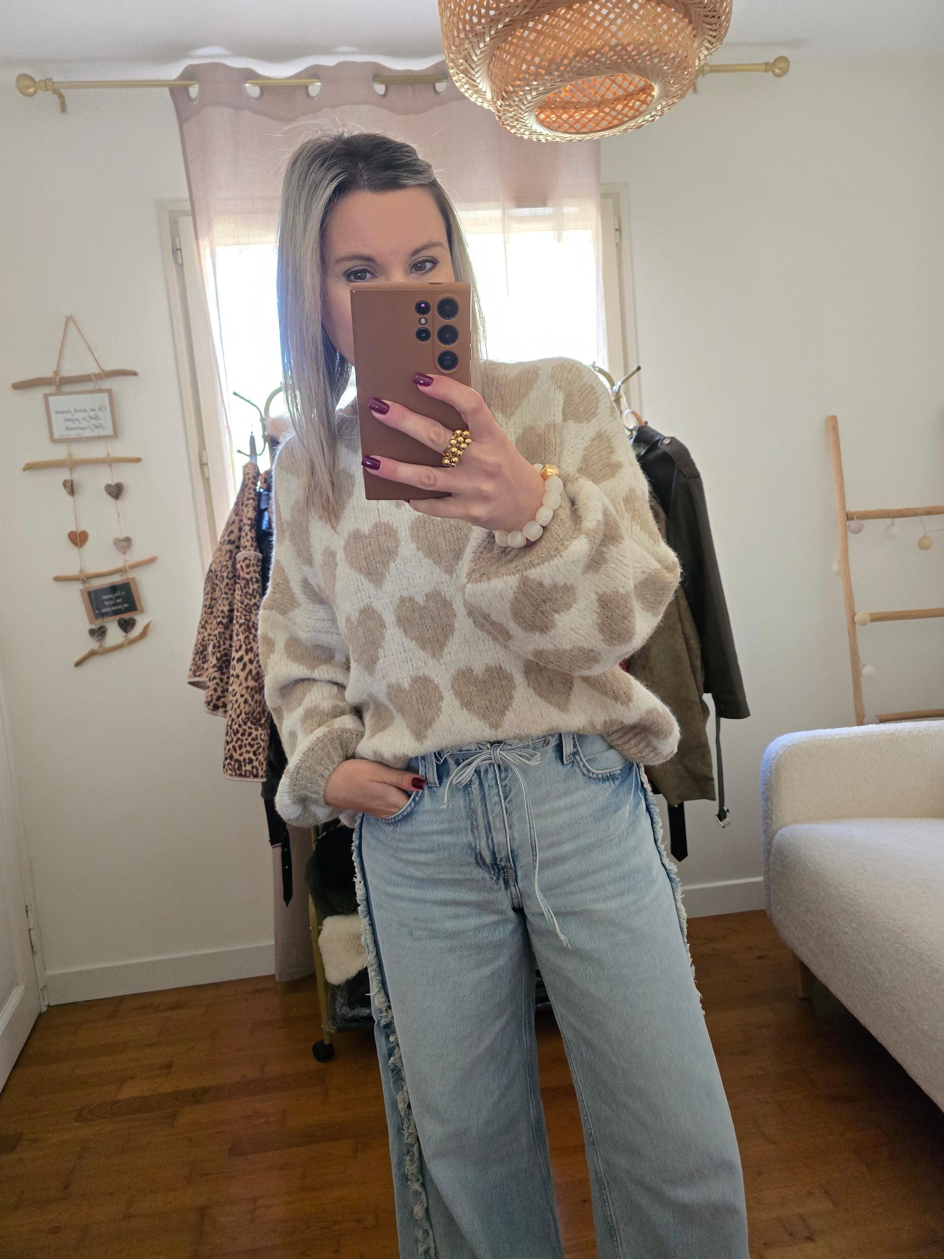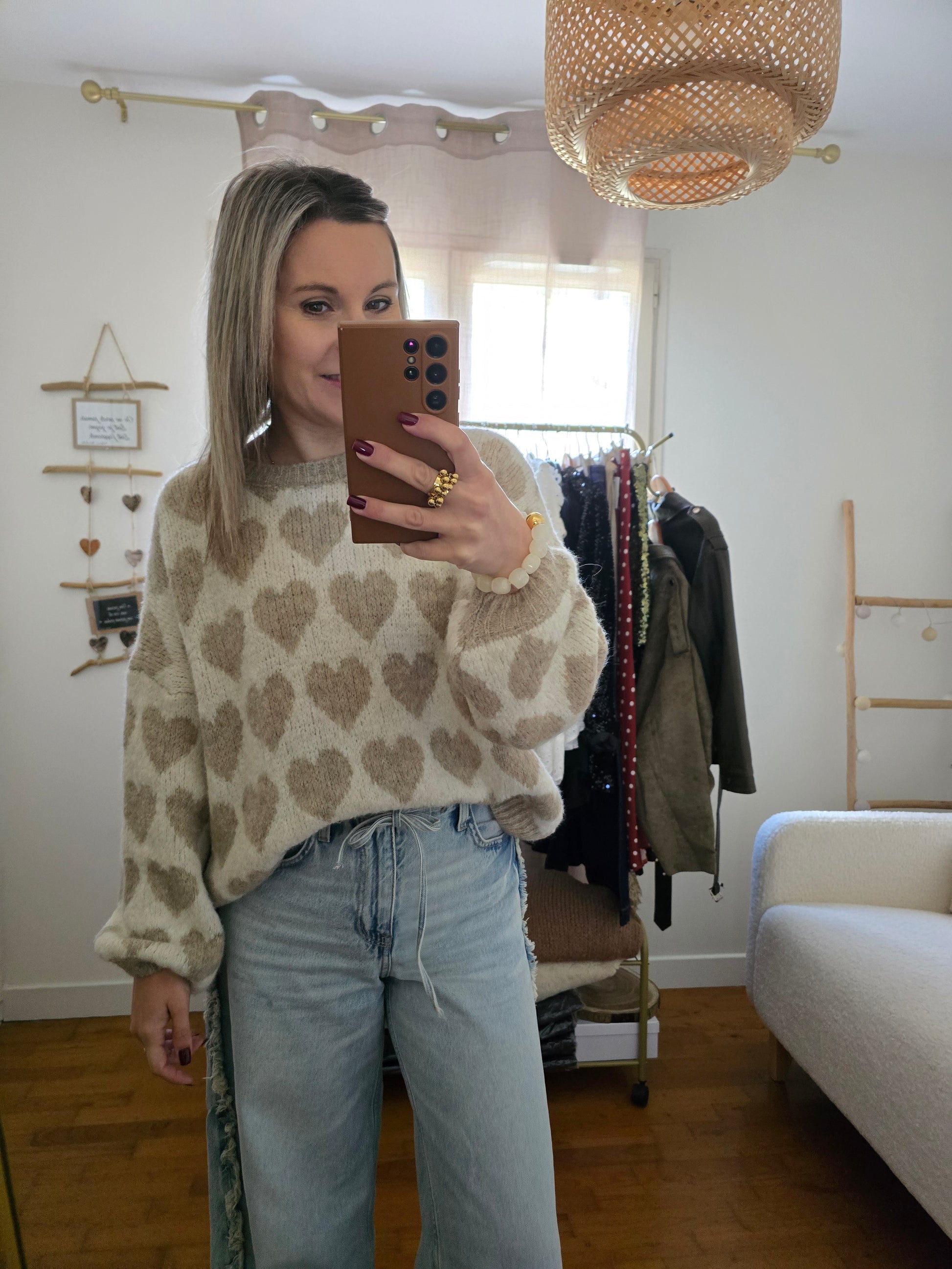 . Joli pull à motifs coeurs beiges sur fond écru, tout doux