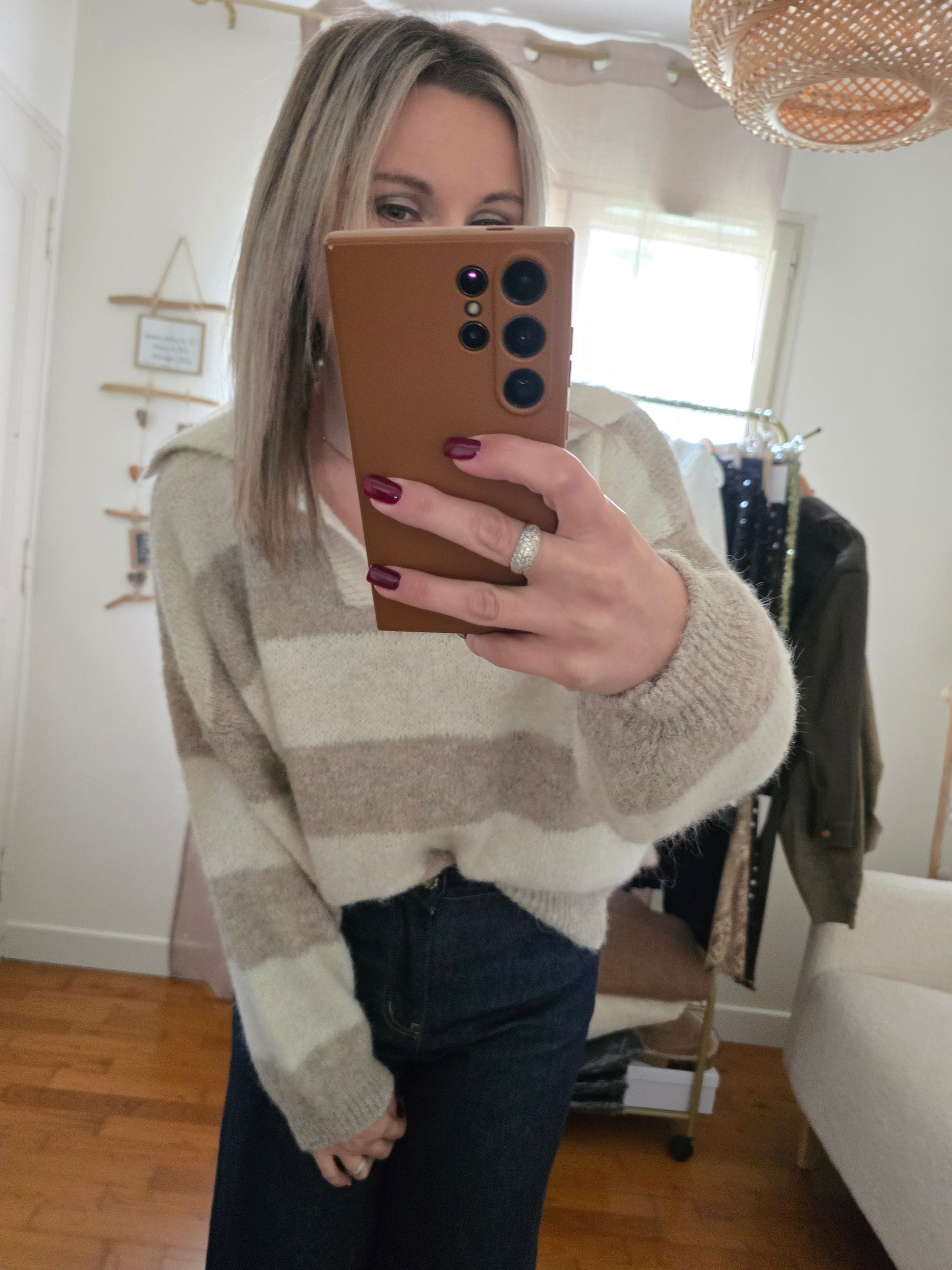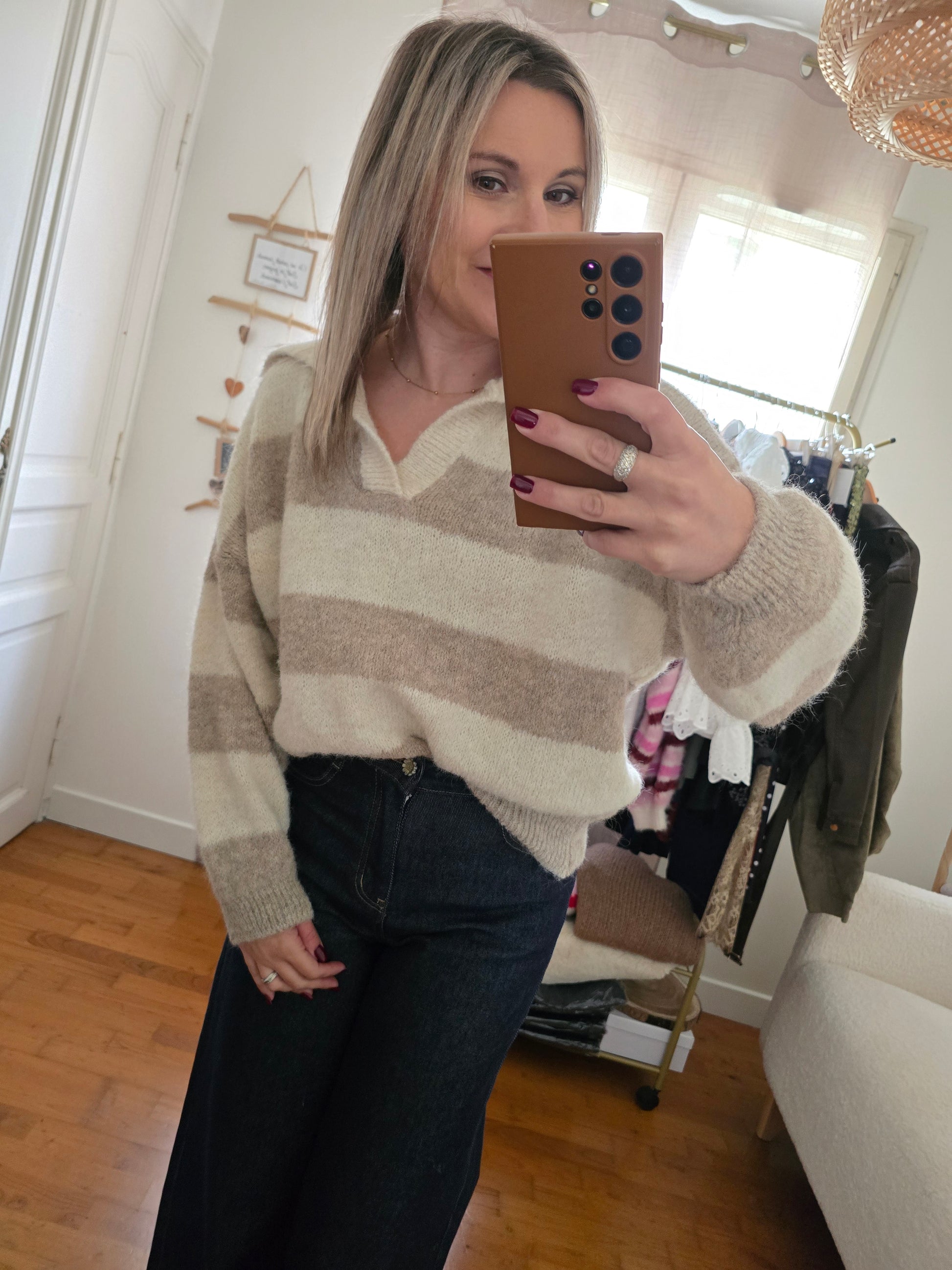 . Pull tout doux à larges rayures et col polo.